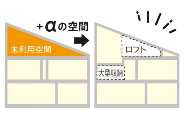 未利用空間として無駄なスペースとなりがちな屋根裏空間を独自の方法で大型収納やロフトとして利用。